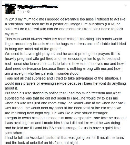 We used to have night prayers and he would prolong the prayers till his heavily pregnant wife got tired and he'll encourage her to go to bed and rest...once she leaves he starts to tell me how much he loves me and how i dont need deliverance because there is nothing wrong with me, and how i am a nice girl who her parents misunderstood.